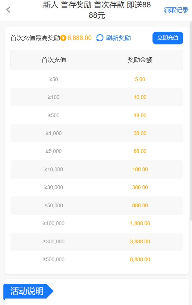 ✅【首存奖励①】50+5/100+10/500+18/1000+38(多IP一律不处理,不听解释)✅【满周奖励②】注册满周送豪礼,累计存款200元,最高可获8888元!✅【满月奖励③】注册满月送豪礼,累计存款2000元,最高可获8888元!✅【周末狂欢】每周末存款赠送5%入款金额,会员狂欢,礼上贺礼!✅【月月返利】每月10月3日,存款达到500元,最高可获8888元!其他优惠请自行查看官网活动,就不一一介绍了